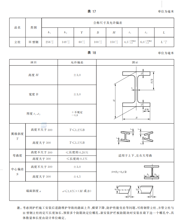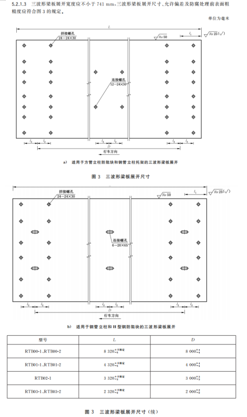 m) 增加了三波形梁板中部連接螺孔數量應根據鋼管立柱間距設置的要求、展開尺寸及允許偏差的要求(見5.2.1.1~5.2.1.3);