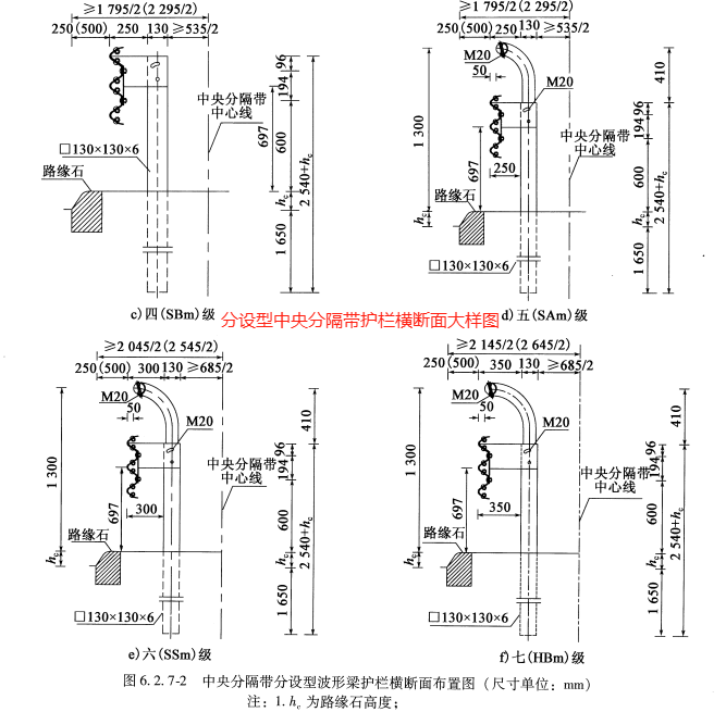 防護(hù)等級為二至七(代碼分別為 Bm、 Am、SBm、 SAm、 SSm、 HBm )級的分設(shè)型中央分隔帶護(hù)欄的構(gòu)造形式與二至七(代碼分別為 B、A、SB、 SA、SS、HB )級的路側(cè)護(hù)欄基本相同。
