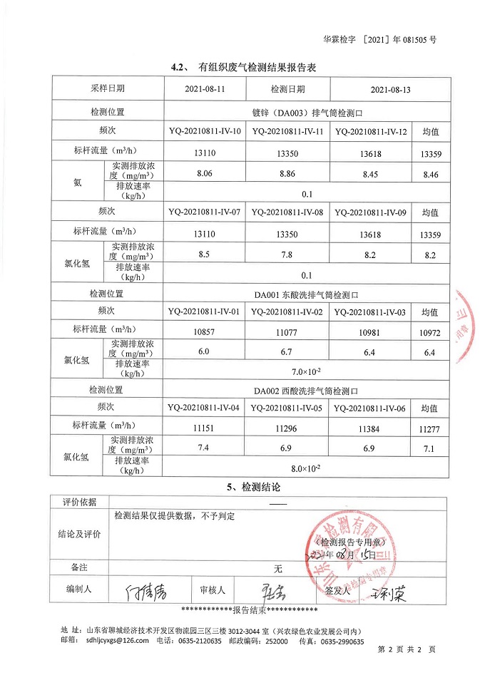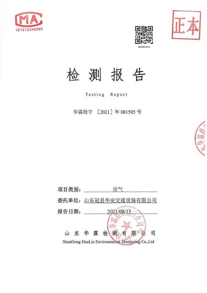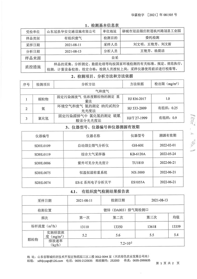 山東冠縣華安交通設施有限公司 2021年第三季度有組織廢氣檢測報告公示(一)